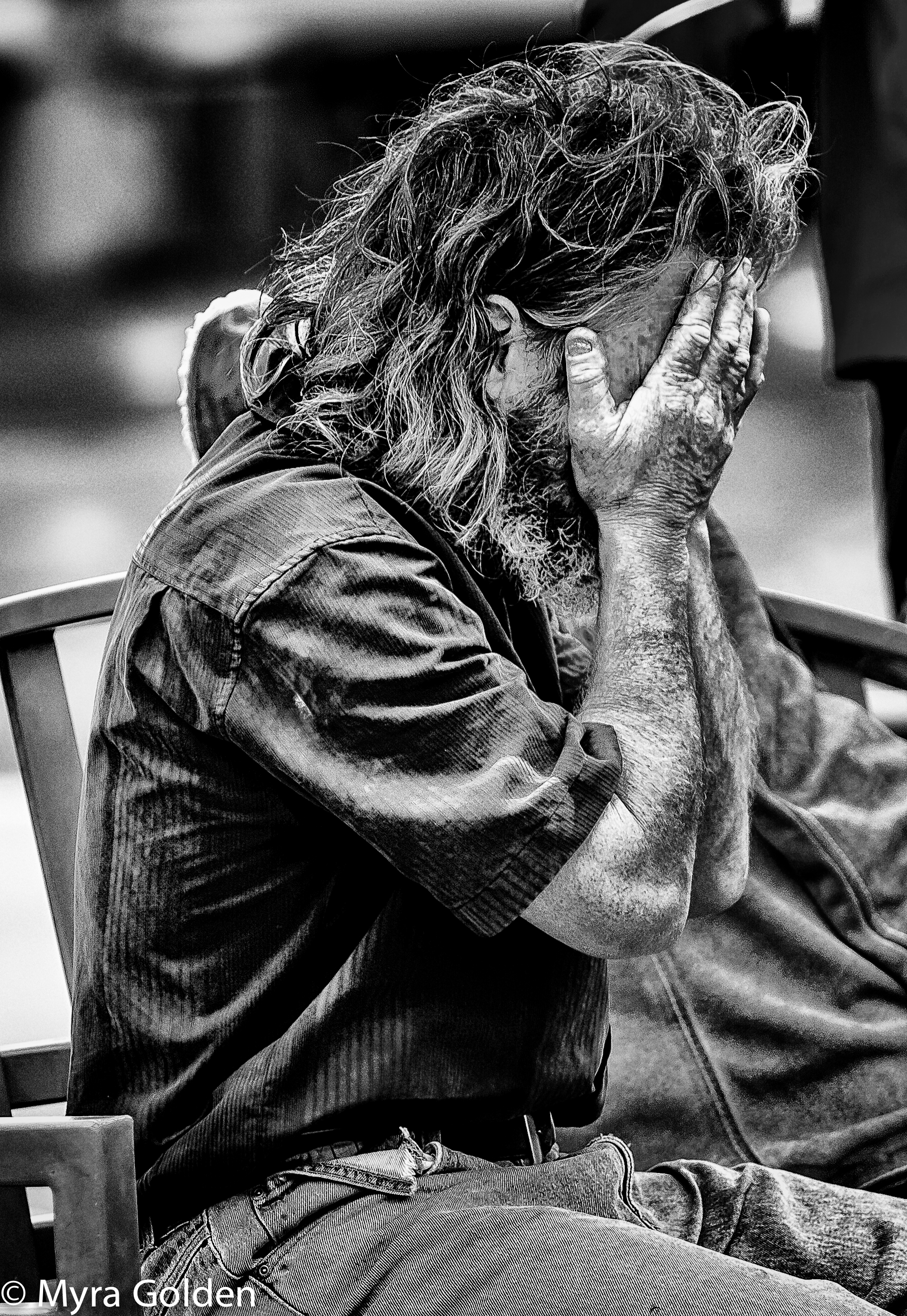 When I feel stressed or overwhelmed with work, I often pick up my camera and go. This morning I went to a park by the river to take some shots of a waterfall. While I was shooting the waterfall, a man was trimming a tree with his bare hands. I initially thought the man worked for the parks and recreation department, but when he moved closer, I saw that he wore ragged jeans and a dirty shirt instead of a uniform. There was no park & recreation vehicle nearby. On the bench in front of the waterfall was a jacket and an over-stuffed backpack. I presumed they belonged to the tree-trimming man. I think he may have been homeless. His diligence and skill with the tree trimming impressed me. I think he trimmed the tree simply because it needed trimming. After he finished trimming the tree, he sat on the bench next to the jacket and backpack. As he rested and regrouped on the bench, I captured this shot, just as he rubbed his face with his rugged, dirty hands.