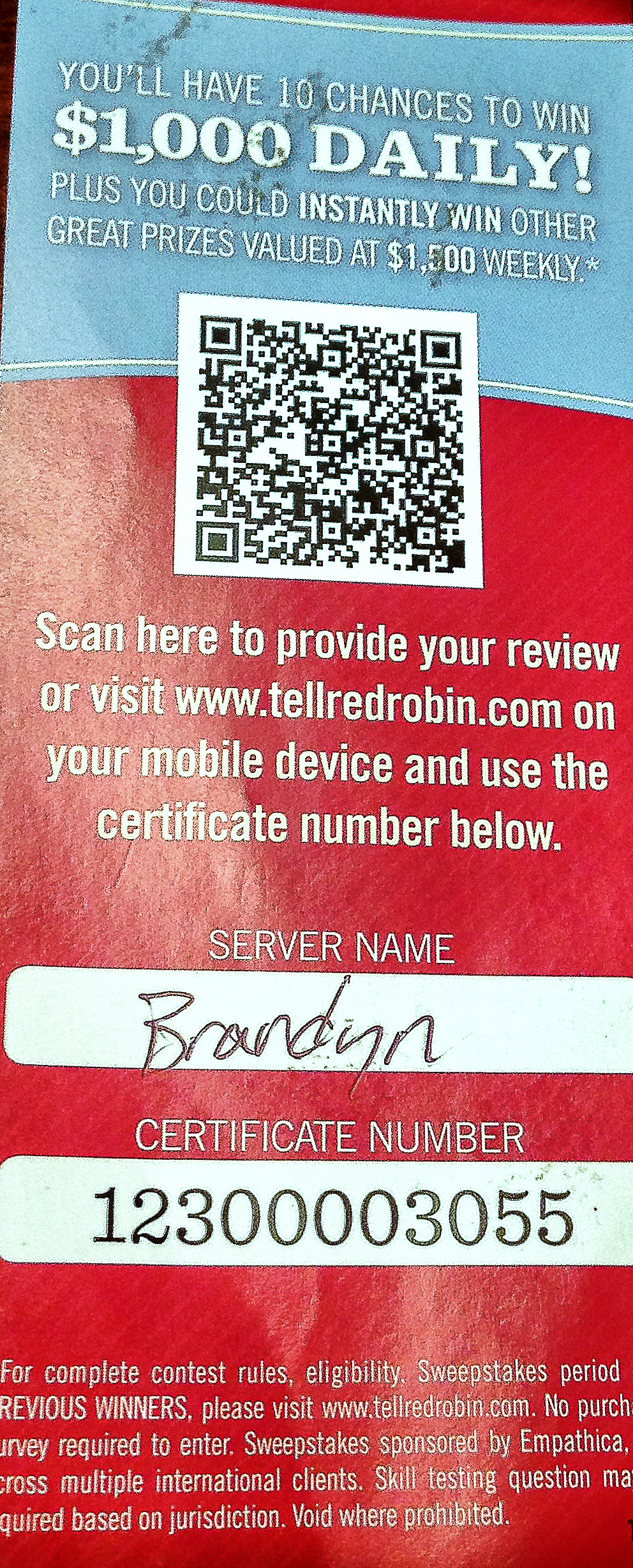 The family and I had dinner on Friday night at Red Robin. The food was good and so was the service. After dinner, Brandon, our wonderful server, handed my husband this survey invitation.