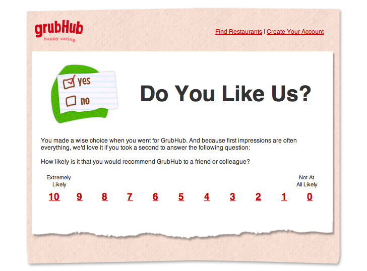 The Grub Hub survey asks a single question. “How likely is it that you would recommend Grub Hub to a friend or colleague?” That’s it.