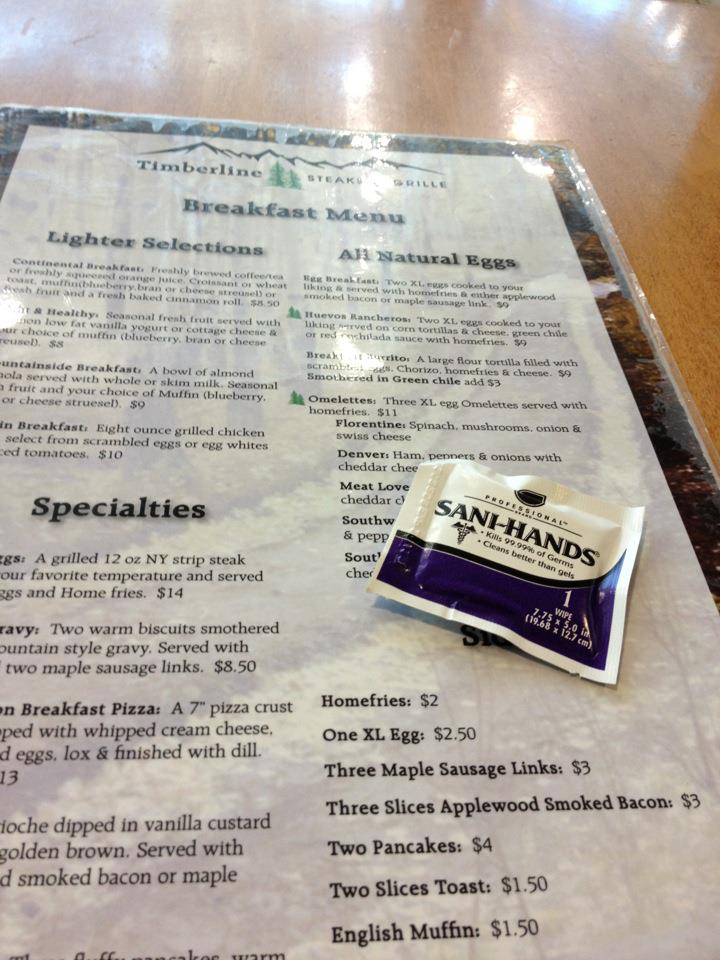 So, I sit down for a quick breakfast in the airport at a friendly joint called Timberline Steaks and the hostess hands me a sanitizing wipe with my menu. What a wonderful value-added service! Airports are filthy. Our roller bags reek with germs. Do you ever think about how many people have sat in seat 14C before you? Giving customers sanitizer in an airport restaurant is a warm gesture. It says, “We know you’re in a high-traffic area filled with germs and that you probably didn’t have a chance to wash before joining us.“ It says they care enough to be proactive, to go the extra mile.