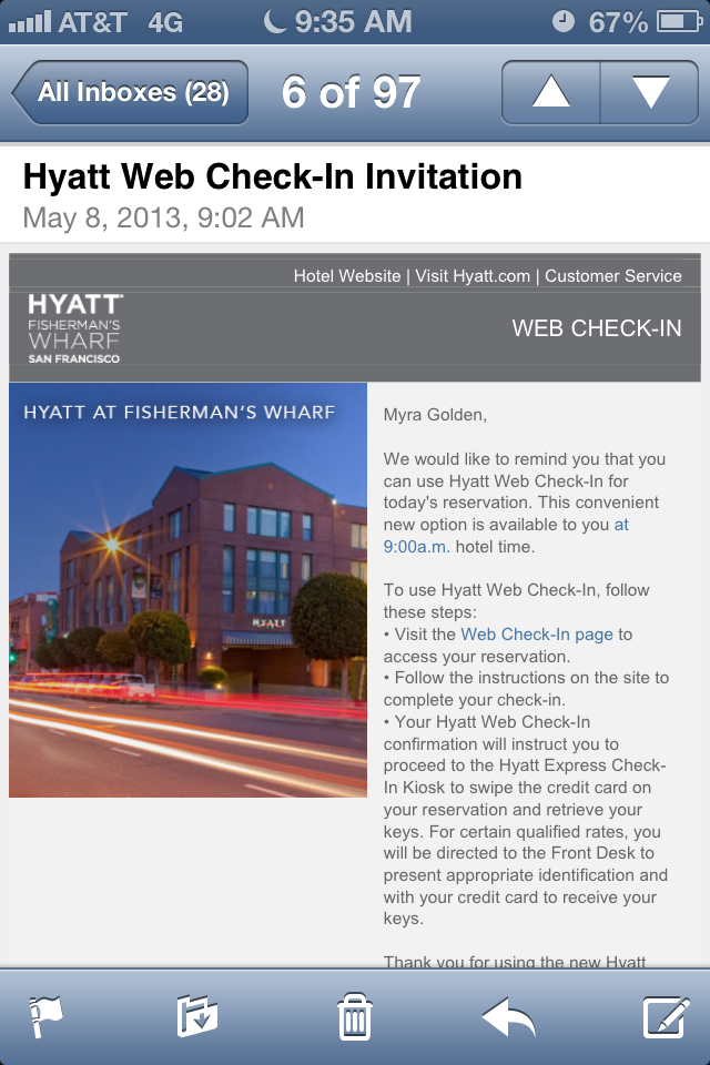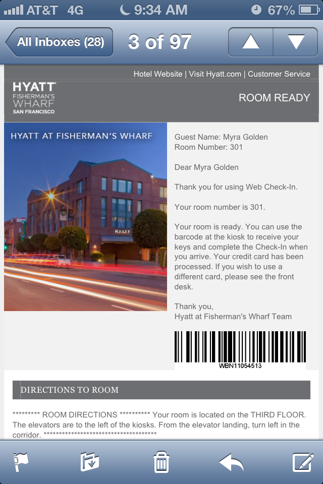This email was such a welcome message in my inbox. I got my room number, directions to my room and easy barcode scan instructions.