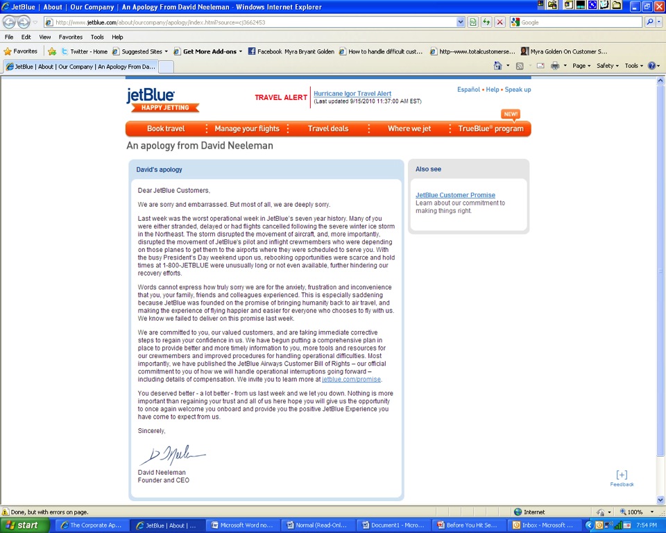 Take a look at this outright apology from JetBlue Airlines after a major service mishap. (See the first sentence of JetBlue’s response)