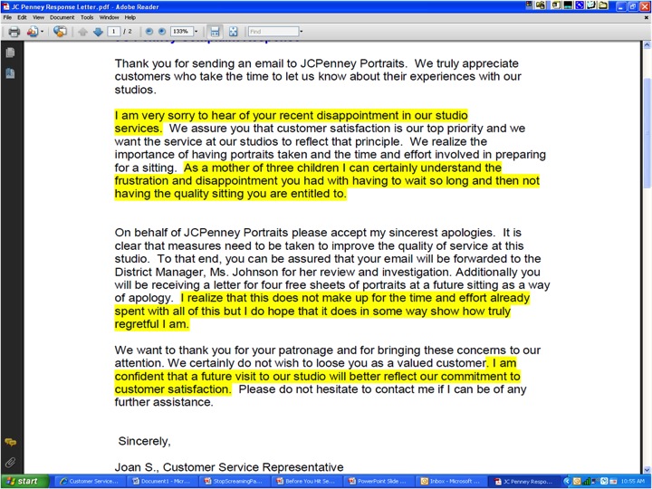 “To that end, you can be assured that your email will be forwarded to the District Manager, Ms. Johnson for her review and investigation. Additionally you will be receiving a letter for four free sheets of portraits at a future sitting as a way of apology. I realize that this does not make up for the time and effort already spent with all of this but I do hope that it does in some way show how truly regretful I am.”