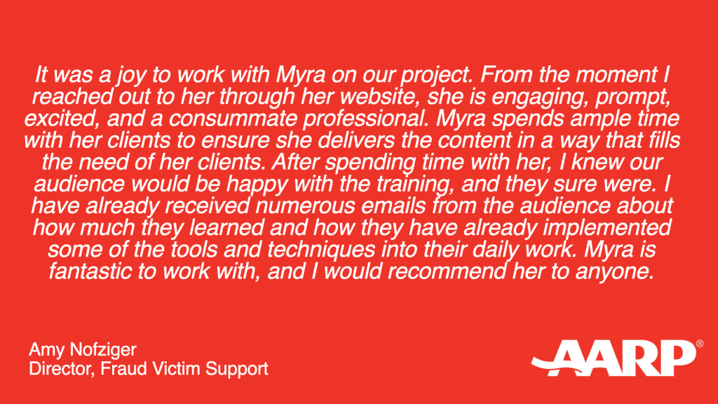 Details matter! I engage your employees with my energy, rich content, exceptional customization, graphics & overlays. I use professional lighting and audio and a robust internet connection over hardwire (ethernet). To make things easy, I make workshop handouts PDF fillable, so your employees can type right on the worksheets, without a need for printing (helpful for remote employees).