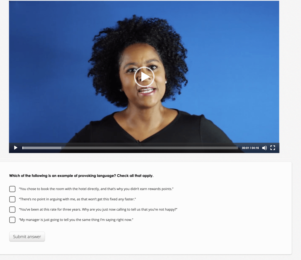 Customer Service online training to help your employees speak and write with friendliness and empathy, and to handle difficult customers with more ease – with scenarios, progress reports, and knowledge checks.